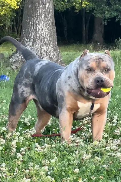 MR. PERFECT, also know as BLUE around here would be classified as a standard size bully. He has a shy confident personality with a drive for chasing his favorite ball. He has a perfect blue tri coat that is stunning in the sunlight.