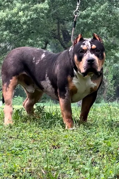BILLION is the perfect example of an AMERICAN BULLY all the way from the UK. His drive and athletic ability are impressive to watch. His muscular frame is perfectly decorated in a lilac tri merle coat. He is a must see in person!