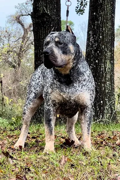 TEXAS PLAYBOY is by far recognized by his unique appearance. He is a black tri with a fully suited roan coat. He has proven to be a producer of the roan pattern. He is “top dog” here at Bullies of Texas. He definitely knows it!